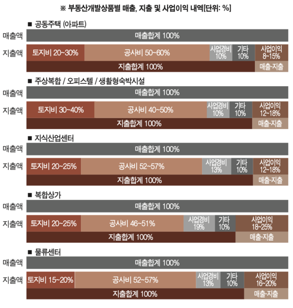 상기 토지비, 공사비 등 지출에 대한 비율은 일반적인 개발사업의 사례를 반영한 것이나, 토지비의 변동성은 사업지의 위치에 따라 크게 다를 수 있습니다. 극단적인 예로, 강남의 토지비와 지방의 토지비는 크게 다를 것이고, 이에 따른 공사비 비중도 연동되어 크게 달라질 수 있기 때문입니다. 하지만 토지비, 공사비 등 지출 변동성이 있을 수는 있으나, 매출액 대비 개발 상품별 적정 개발 수익률(사업이익)은 상기 수준과 거의 유사하다고 보면 됩니다. 즉, 각 상품별 매출액을 알게 된다면 시행사의 적정 이익 수준을 어느 정도는 추정할 수도 있습니다. 예를 들어, 아파트개발 매출액이 1,000억 원일 경우, 시행이익은 보통 80~130억 원 수준이라고 예측할 수 있고, 물류센터개발 매출액이 1,000억 원일 경우, 시행이익은 보통 160~200억 수준으로 예측할 수 있습니다.