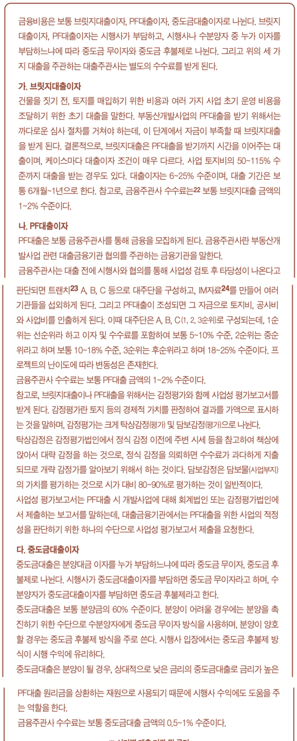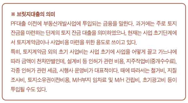 PF대출 전에 지출되는 비용을 보통 사업 초기자금이라고 하며, 사업 초기자금은 보통 토지계약금, 토지계약금 외 초기사업비로 이루어지나, 때에 따라선 토지비 중도금 및 잔금이 포함되기도 합니다. 그리고 개발부지를 계약한 시점부터 PF대출 전까지 토지비 중 잔금 및 사업 초기 비용을 대출로 활용하였다면 그것을 <브릿지대출>이라고 부르며, 대부분 대출금융기관을 통해 조달합니다.