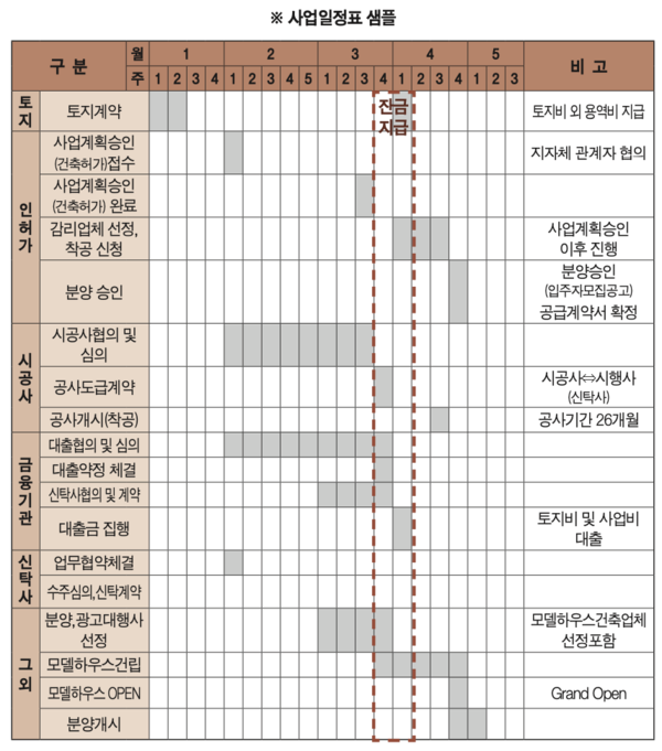 상기의 설명대로 인허가 기간의 차이는 천차만별이지만, 인허가 기간을 편의상 짧게 가정하여 사업일정표 샘플을 이해하기 쉽게 정리해보았습니다. 왼쪽 페이지 사업일정표 샘플을 통해 초기 개발사업 일정의 흐름을 개략적으로나마 짐작해보기 바랍니다.