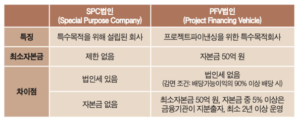 PFV 구조의 법인을 이용한 사업은 주로 대규모 부동산개발사업에서 사용됩니다. 보통 시행사, 시공사, 금융기관이 자금을 각각 출자하여 공동으로 설립하는데, 이익과 위험 부담을 공유한다. 최소자본금은 50억 원(50억 중 5%인 2.5억은 금융기관의 자본금)이며, 해당 법인은 법인세 등의 세제 감면 혜택이 있어 수익성도 상대적으로 높은 편입니다.