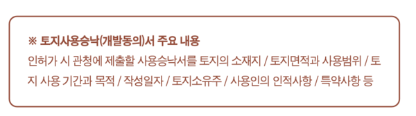 매수자인 시행사는 개발을 위한 인허가를 진행하여야 한다. 소유권이 매수자에게 이전되기 전이라면, 현재 토지 소유자인 매도자에게 개발에 동의한다는 토지사용승낙(개발동의)서를 받아야 한다. 만약에 토지의 소유권이 잔금 이전에 타인에게 이전될 경우, 새로운 소유주에게 다시 사용승낙을 받아야 한다.