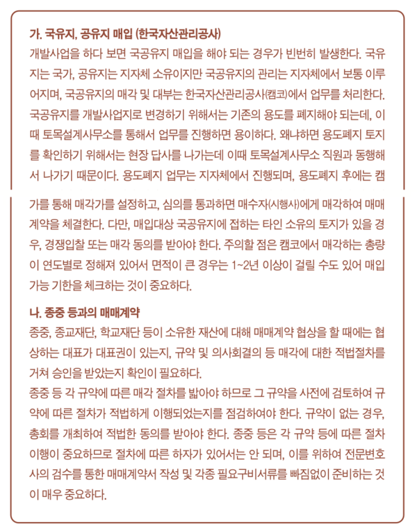 사업성 검토를 통해 개발사업을 진행하기로 의사결정이 되었다면 본격적인 사업부지 매입 단계에 돌입해야 됩니다. 사업부지 매입과 관련하여 부동산개발 업계에선 오직 1등만이 존재한다고들 합니다. 그 이유는 개발사업부지는 오직 하나만 존재하기 때문입니다. 그렇다고 덜컥 계약을 해야 한다는 말은 아닙니다. 매매계약의 조건 등 다양한 리스크를 신중히 검토한 후, 매입 결정을 해야 합니다. 아무리 사업성이 좋을지라도, 사업부지 매매계약 조건 등 부지 매입 단계부터 문제가 발생된다면 그 리스크는 온전히 시행사가 감당해야 하기 때문입니다.