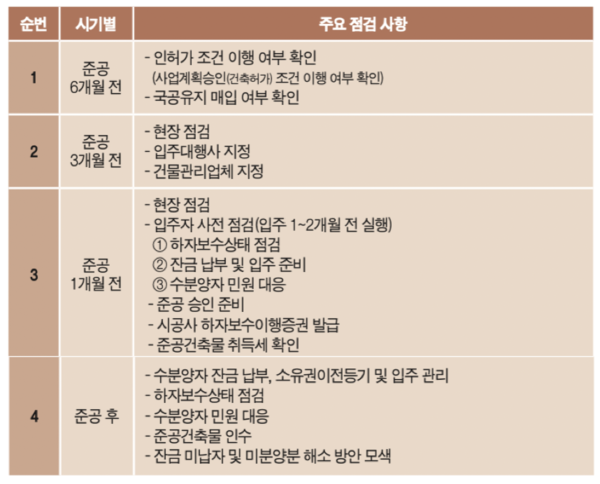 준공 전 입주를 위한 입주자 사전점검을 실시해야 합니다. 입주자 사전점검은 보통 준공 1~2개월 전에 진행됩니다.