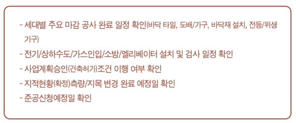 시행사는 시공사에게 준공을 위한 마무리 공사와 준공 인허가 상태를 최종 확인하여 준공일정에 이상이 없는지 다음과 같이 파악해야 합니다. 참고로, 현장과 별도로 실제 분양상품과 모델하우스 도면, 마감자재, 분양 카탈로그와의 최종 일치 여부도 확인해 보는 게 좋습니다.