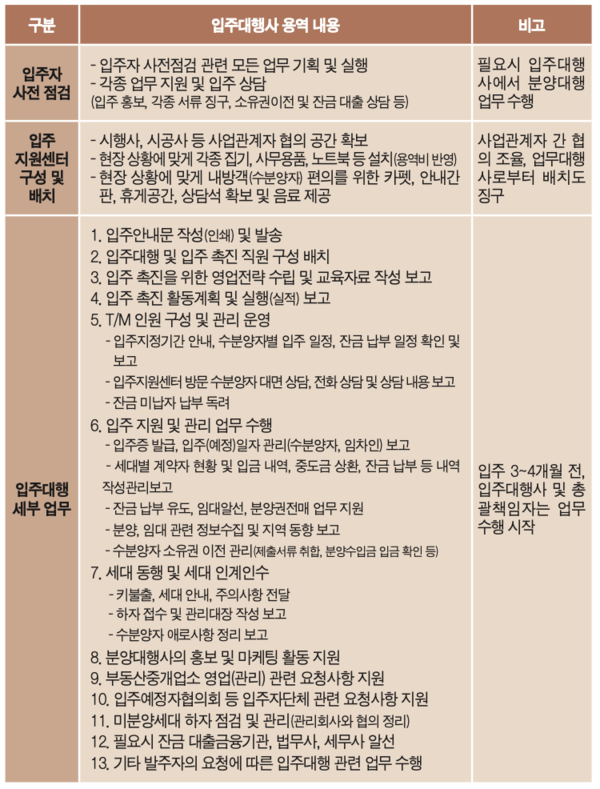 시행사는 현장 여건에 맞게 다음의 내용을 고려하여 입주대행용역 업무 범위를 설정하면 됩니다.