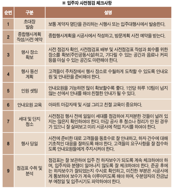 입주자 사전점검은 하자보수사항을 점검해야 하므로 시공사가 책임지고 진행하며, 이때 입주대행사는 시공사의 업무를 지원하고, 시행사는 행사 전체를 총괄하게 됩니다.