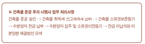 건축물이 준공된 후 시행사는 준공건축물에 대한 소유권보존등기를 진행하고, 수분양자의 잔금을 받아 수분양자 입주 및 소유권이전등기를 처리해주어야 합니다.