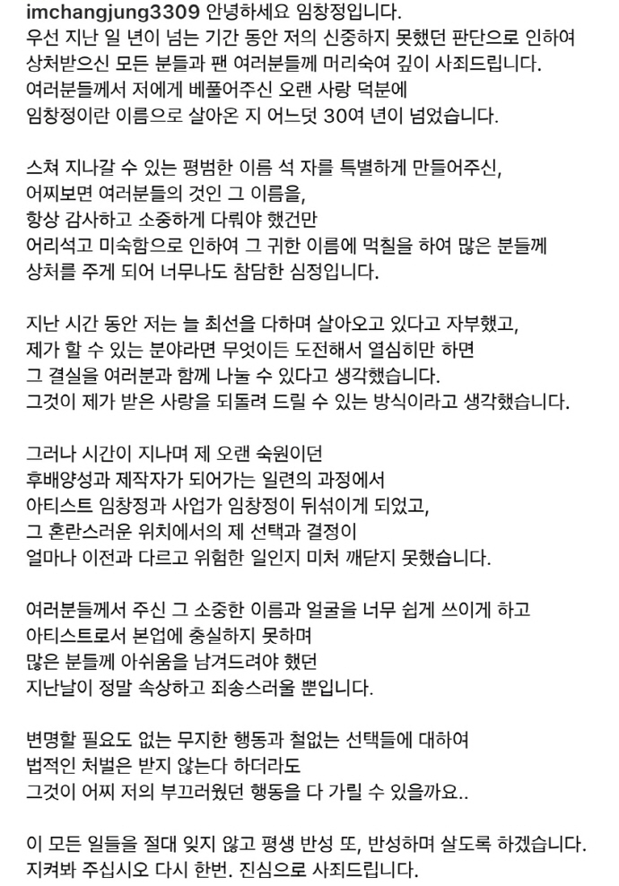 임창정은 10일 자신의 인스타그램에 “우선 지난 일 년이 넘는 기간 동안 저의 신중하지 못했던 판단으로 인해 상처받으신 모든 분들과 팬 여러분들께 머리숙여 깊이 사죄드린다”고 공개를 숙였다. “어리석고 미숙함으로 인해 귀한 이름에 먹칠을 해 많은 분들께 상처를 주게 돼 너무나도 참담한 심정”이라는 것이다.