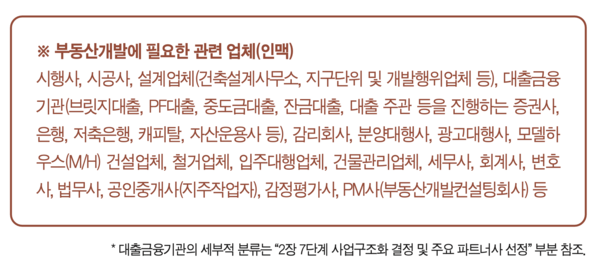 또한, 사업부지 매매대금 등 부동산개발 사업을 하기 위한 초기 자금이 부족할 경우에 금융기관의 초기사업자금 대출을 통해 개발사업을 영위할 수 있기 때문에 금융기관과의 연대를 가져가는 것도 좋은 전략 중 하나입니다.
