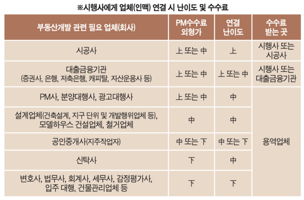 스스로 PM을 할 경우에는 위 업체들을 시행사에 연결하여 부동산개발 참여에 확정되면 그에 따른 성공 보수로 수수료를 받을 수 있습니다. 업체 선정을 도와주는 것도 PM 영역 중 하나이며, 보통 업계에서는 <PM> 또는 <연결PM>이라고 말합니다.