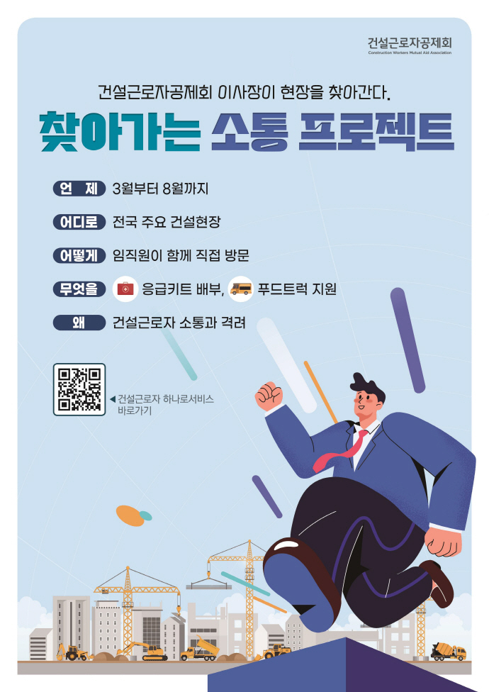 행사내용은 건설근로자공제회 이사장과 권역별 지사장이 점심시간(오전11시~오후1시)에 건설현장을 찾아가 근로자와 소통하고 격려하는 시간을 갖는다.