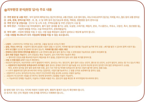 외부환경 분석을 위해서는 상기 내용 외에도 주의 깊게 챙겨야 할 요소들이 많습니다. 외부환경은 분양성과 사업 진행 결정에 매우 중요한 부분을 차지하기 때문입니다. 외부환경에 대해 체크해야 될 주요 사항은 다음과 같습니다.
