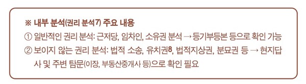 <외부환경 분석>과 함께 내부 분석도 필요합니다. <내부 분석> 같은 경우, 등기부등본을 통해 확인 가능하나, 보이지 않는 권리 분석까지 하여야 하기 때문에 주의 깊게 살펴봐야 합니다. 소송 등 보이지 않는 권리를 파악하지 못하고, 토지매매계약을 하였을 경우, 사업 진행 자체가 불가한 경우도 많이 발생하기 때문에 <외부환경 분석>과 함께 <내부 분석>도 잘 확인해야 합니다. 실제로 ‘토지주’의 이중매매 계약으로 피해를 입어 또 다른 매수자와 소송 진행을 하였으나, 패소하여 결국 계약금을 날린 사례도 있습니다. 또, 소송 진행 중인 부지를 계약하였으나, 소송이 장기화되어 사업 진행이 불가하게 된 정말 억울한 피해를 입기도 하니, 겪지 않아도 될 일을 위 내용들을 통한 확인만으로도 리스크를 줄일 수 있습니다.
